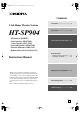 HT-SP904_En.book Page 2 Wednesday, July 11, 2007 12:13 PM WARNING: TO REDUCE THE RISK OF FIRE OR ELECTRIC SHOCK, DO NOT EXPOSE THIS APPARATUS TO RAIN OR MOISTURE. CAUTION: TO REDUCE THE RISK OF ELECTRIC SHOCK, DO NOT REMOVE COVER (OR BACK). NO USER-SERVICEABLE PARTS INSIDE. REFER SERVICING TO QUALIFIED SERVICE PERSONNEL.