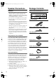 HT-SP904_En.book Page 3 Wednesday, July 11, 2007 12:13 PM Precautions 1. Recording Copyright—Unless it’s for personal use only, recording copyrighted material is illegal without the permission of the copyright holder. 2. AC Fuse—The AC fuse inside the unit is not userserviceable. If you cannot turn on the unit, contact your Onkyo dealer. 3. Care—Occasionally you should dust the unit all over with a soft cloth. For stubborn stains, use a soft cloth dampened with a weak solution of mild detergent and water.