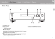 > Vóór het Starten > Namen van de onderdelen > Installeren > Initial Setup > Afspelen Geavanceerde Setup | Firmware-update | Overige Voorpaneel Namen van de onderdelen 1. ÍON/STANDBY-knop: Schakelt het toestel in of schakelt het naar de stand-by-modus. 2. Afstandsbedieningssensor 3. Display ( P6) 4. Afspeelknop: ∫ : Deze toets stopt afspelen. 1/; : Afspelen of afspelen pauzeren. 5.