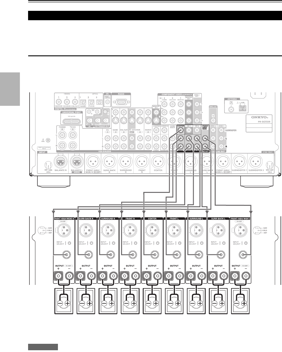 Zie de gebruiksaanwijzing van uw multikanaals eindversterker voor meer informatie over aansluiting van luidsprekers.