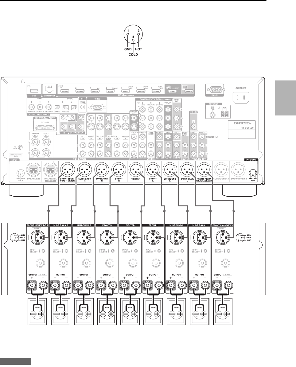 De AV Controller’s gebalanceerde PRE OUT-aansluitingen zijn bekabeld zoals weergegeven.