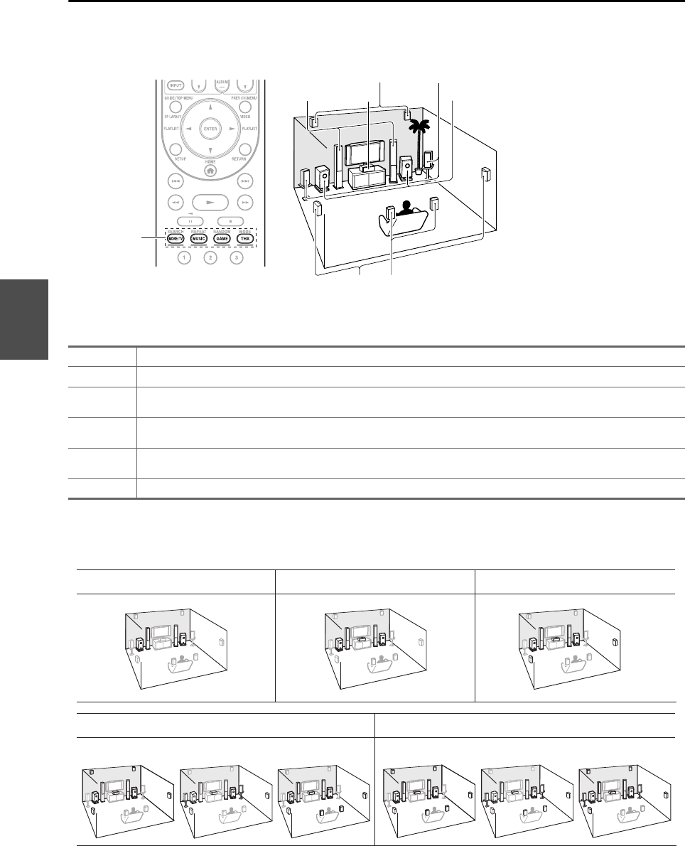 För att använda denna layout, ställ in ”Front High + Front Wide” till ”Nej” (➔ sidan 52) och aktivera ”Surround Back”