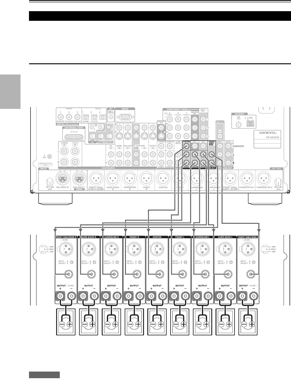 OUT-Buchsen des AV-Controllers mit den Eingängen des Verstärkers und die Lautsprecher mit den Lautsprecher-