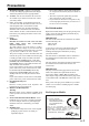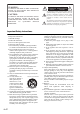 Precautions 1. Recording Copyright—Unless it’s for personal use only, recording copyrighted material is illegal without the permission of the copyright holder. 2. AC Fuse—The AC fuse inside the unit is not userserviceable. If you cannot turn on the unit, contact your Onkyo dealer. 3. Care—Occasionally you should dust the unit all over with a soft cloth. For stubborn stains, use a soft cloth dampened with a weak solution of mild detergent and water. Dry the unit immediately afterwards with a clean cloth.