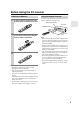 Before Using the AV receiver Installing the Batteries 1 To open the battery compartment, press the small hollow and slide open the cover. Using the Remote Controller To use the remote controller, point it at the AV receiver’s remote control sensor, as shown below. Remote control sensor AV receiver STANDBY indicator 2 3 Insert the two supplied batteries (AA/R6) in accordance with the polarity diagram inside the battery compartment. Slide the cover shut. Approx. 16 ft.