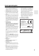 Försiktighetsåtgärder 1. Angående upphovsrätt—Så länge det inte endast är för privat bruk är det förbjudet att kopiera upphovsrättsskyddat material utan upphovsrättsinnehavarens tillstånd. 2. Nätströmssäkring—Nätströmssäkringen i apparaten ska inte bytas ut av användaren. Kontakta en Onkyohandlare, om strömmen till apparaten inte kan slås på. 3. Vård—Torka då och då av utsidan på apparaten med en mjuk trasa.