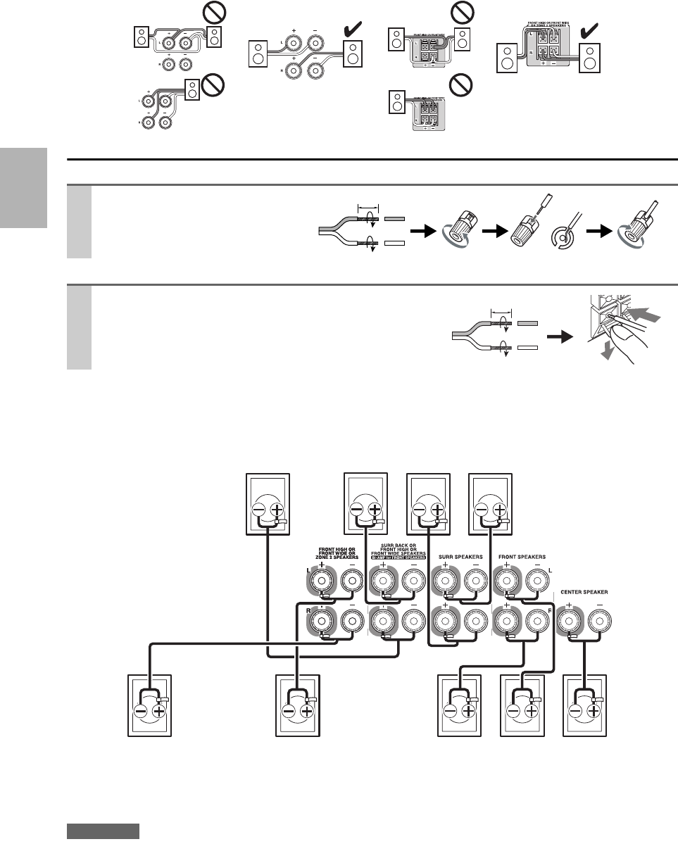 • Verbinden Sie nicht mehr als ein Kabel mit jedem Lautsprecheranschluss. Andernfalls könnte der AV-Receiver beschä-
