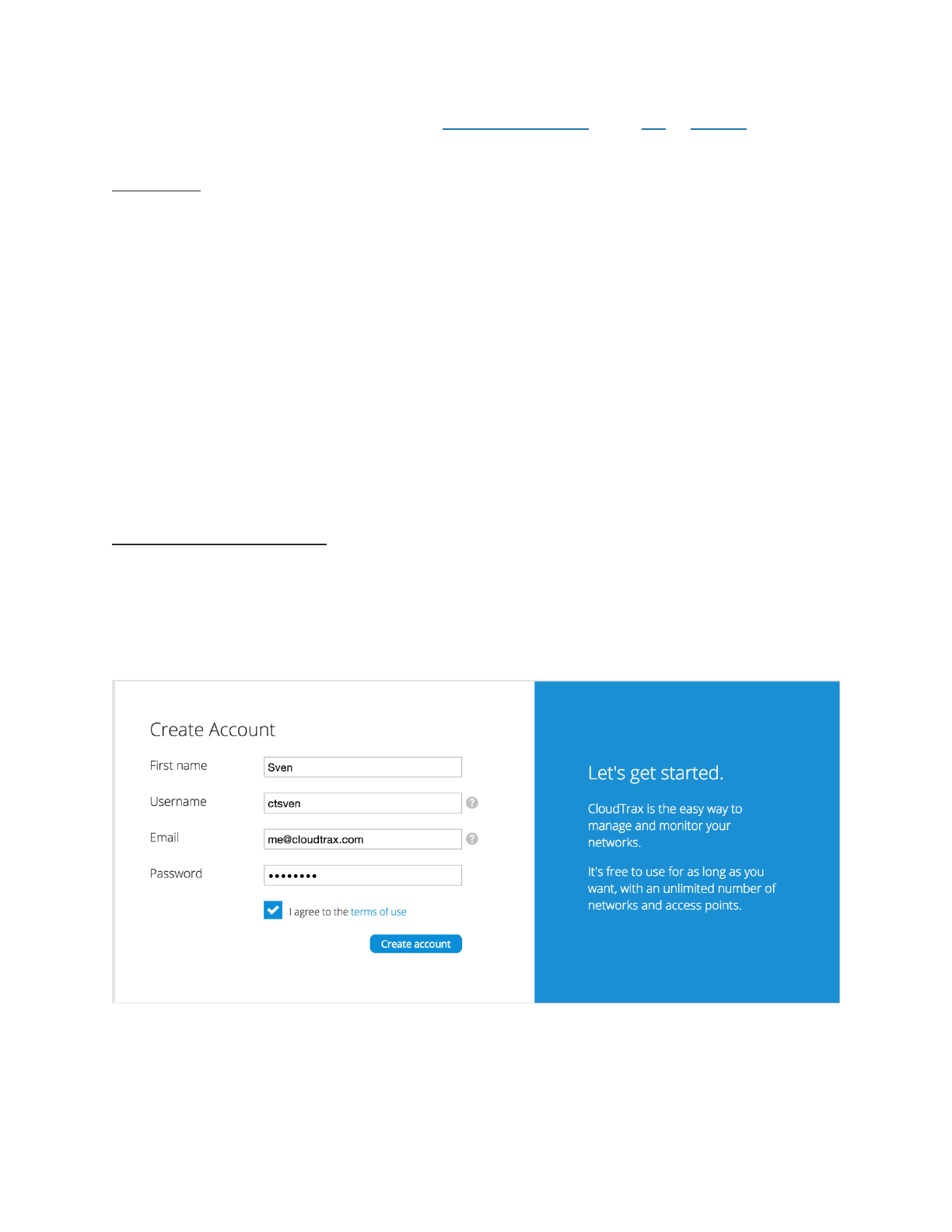 From CloudTrax.com, click the “Create account” link just below the login fields. You’ll see a page