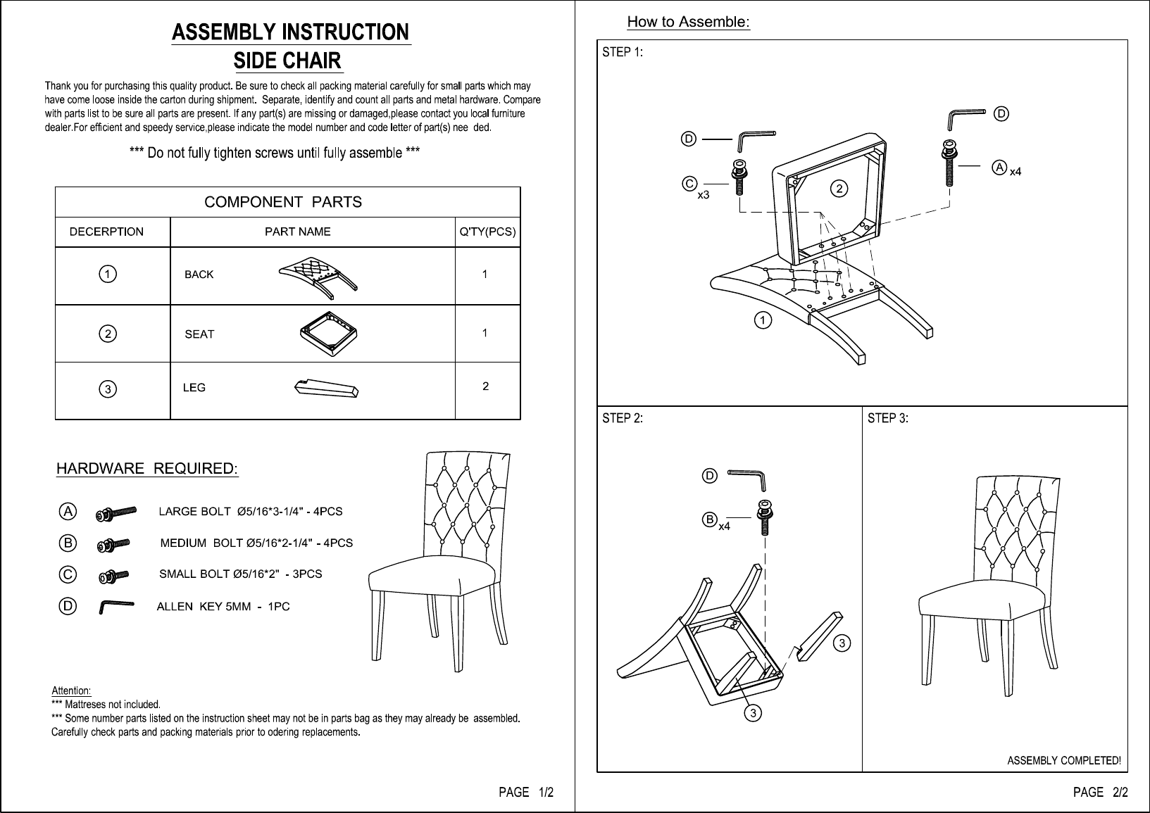 ASSEMBLY INSTRUCTION SIDE CHAIR ‘Thank you for purchasing this quality product. Be sure to check all packing material carefully for small parts which may have come loose inside the carton during shipment. Separate, identify and count all parch and metal hardware. Compare ‘with parts list to be sure all parts are preset. If any parts) are missing or damaged,please contact you local furniture dealer For efficient and speedy serviceable indicate the medal number and aced letter of part{s) nea ded.