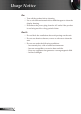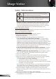 Usage Notice Precautions Please follow all warnings, precautions and maintenance as recommended in this user’s guide. ▀■ Warning- Do not look into the projector’s lens when the lamp is on. The bright light may damage your eyes. ▀■ Warning- To reduce the risk of fire or electric shock, do not expose this projector to rain or moisture. ▀■ Warning- Please do not open or disassemble the projector as this may cause electric shock.