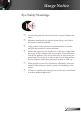 User Controls Using the Remote Control Remote Control English 20 Menu Press “Menu” to launch the on-screen display (OSD) menu. To exit OSD, Press “Menu” again. Zoom Press “+/-” button to zoom in of an image. DVI Press “DVI” to choose DVI source. VGA Press “VGA” to choose source from VGAIN connector. AV Mute Momentarily turns off/on the audio and video. S-Video Press “S-Video” to choose S-Video source. Freeze Press “Freeze” to pause the screen image.