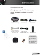 Introduction Package Overview This projector comes with all the items shown below. Check to make sure your unit is complete. Contact your dealer immediately if anything is missing. Projector with lens cap Due to the difference in applications for each country, some regions may have different accessories. Power Cord 1.8m Y-type Cable 100mm USB Cable 1.8m (Available in EMEA and (Available in EMEA only) ASIA version only) VGA Cable 1.