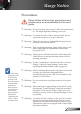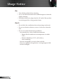 Usage Notice Precautions Please follow all warnings, precautions and maintenance as recommended in this user’s guide. ▀■ Warning- Do not look into the projector’s lens when the lamp is on. The bright light may damage your eyes. ▀■ Warning- To reduce the risk of fire or electric shock, do not expose this projector to rain or moisture. ▀■ Warning- Please do not open or disassemble the projector as this may cause electric shock.