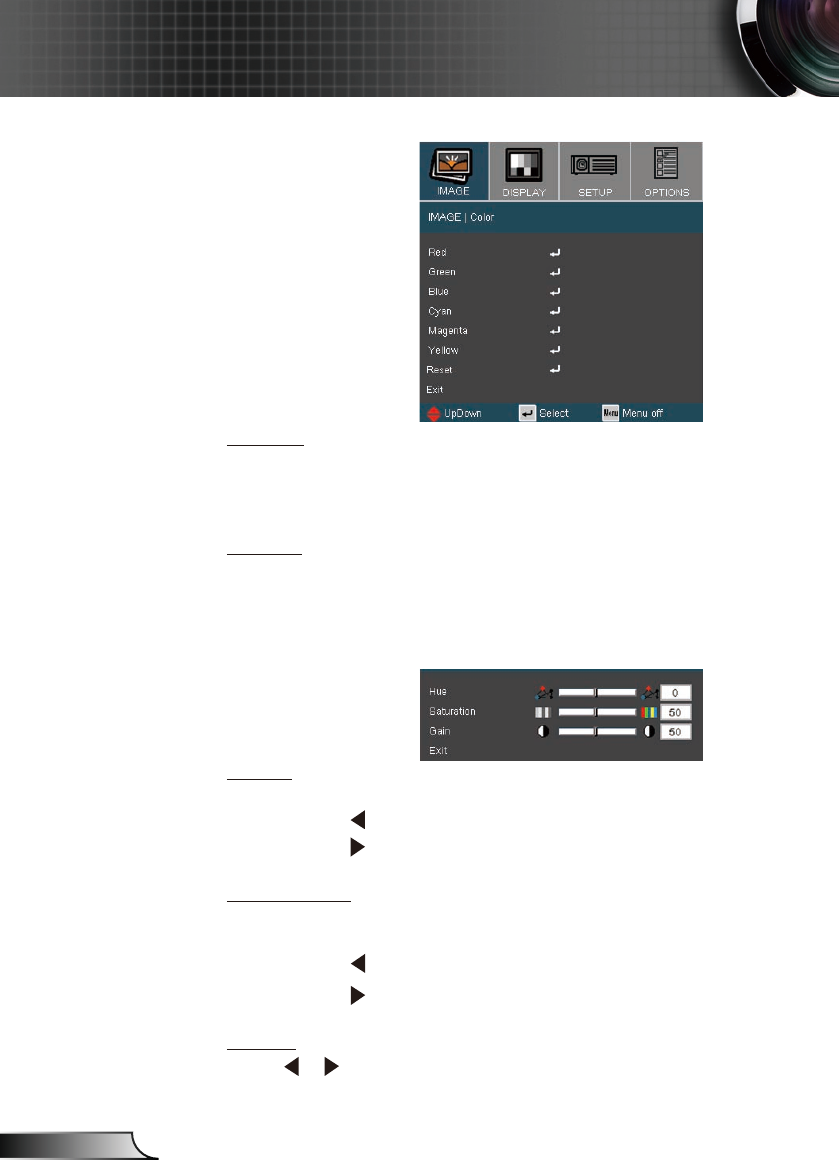 Use or to adjust Red, Green, Blue, Cyan, Magenta and Yellow