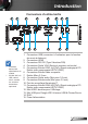 Introduction Aperçu du produit Unité principale 4 10 1 11 10 3 6 L’interface dépend des spécifications du modèle. Ne pas bloquer les entrées/sorties d’aération du projecteur. 2 5 7 8 9 1. Panneau de commandes 2. Bague de réglage de la focale 3. Haut-parleur 4. Bague de zoom 5. Objectif 6. Récepteurs IR 7. Connexions d’entrée/ sortie 8. Prise d’alimentation 9. Pied de réglage inclinable 10. Ventilation (admission) 11.