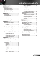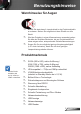Inhaltsverzeichnis Inhaltsverzeichnis.............................1 Benutzungshinweise........................2 Sicherheitshinweise.............................2 Vorsichtsmaßnahmen..........................3 Warnhinweise für Augen......................5 Produktmerkmale.................................5 Einführung........................................6 Lieferumfang........................................6 Produktübersicht..................................7 Projektor.......................................
