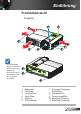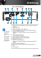 Einführung Produktübersicht Projektor 4 10 1 11 10 3 6 Die Schnittstelle hängt von den technischen Daten des Modells ab. Nicht die Einlass-/ Auslassöffnungen des Projektors blockieren. 2 5 7 8 9 1. 2. 3. 4. 5. 6. Bedienfeld Fokusring Lautsprecher Zoom-Ring Objektiv IR-Empfänger 7. Eingangs-/Ausgangs Anschlüsse 8. Netzanschluss 9. Winkelverstellfüße 10. Belüftung (Eingang) 11.