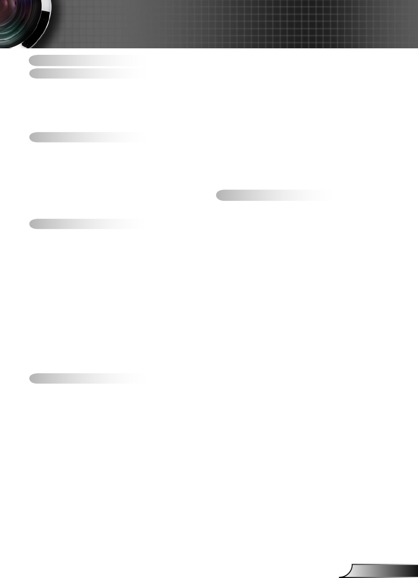 Apêndices A imagem está fora de foco Certifique-se de que a tampa da lente esteja removida. Ajuste o anel de foco na lente do projetor. Se certifique que a tela de projeção está dentro da distância requerida. Consulte a página 17. A imagem é esticada ao exibir um título de DVD de 16:9 Ao reproduzir DVD anamórfico ou DVD 16:9, o projetor mostratrá a melhor imagem quando o modo de exibição do projetor estiver configurado em 16:9 no OSD.