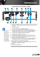 Introducción Información general del producto Unidad principal 4 10 1 11 10 3 6 La interfaz está sujeta a las especificaciones del modelo. No bloquee las entradas/salidas de ventilación del proyector. 2 5 7 8 9 1. Panel de control 2. Anillo de enfoque 3. Altavoces 4. Anillo del zoom 5. Objetivo 6. Receptores de infrarrojos (IR) 7. Conexiones de entrada y salida 8. Toma de alimentación 9. Pie de ajuste de inclinación 10. Ventilación (Entrada) 11.