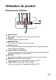 Utilisation du produit Panneau de contrôle 1 2 3 4 5 6 7 8 4 1 2 3 4 5 6 7 8 Alimentation Pour mettre le projecteur sous tension ou hors tension. SOURCE Change entre les signaux d’entrée. MENU/QUITTER Pour afficher ou quitter les menus sur écran. Trapèze ( / ) Pour corriger manuellement les déformations de l'image provoquées par une projection angulaire. Quatre boutons directionnels Utilisez les quatre boutons directionnels pour choisir des éléments ou apporter des réglages à votre sélection.