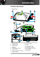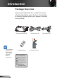 Introduction Package Overview Unpack and inspect the box contents to ensure all parts listed below are in the box. If something is missing, please contact your nearest customer service center. Projector with lens cap Due to different applications in each country, some regions may have different accessories. 2 × AAA Batteries Documentation : User’s Manual Warranty Card Quick Start Card WEEE Card (for EMEA only) English 6 Power Cord 1.8m IR Remote Control VGA Cable 1.