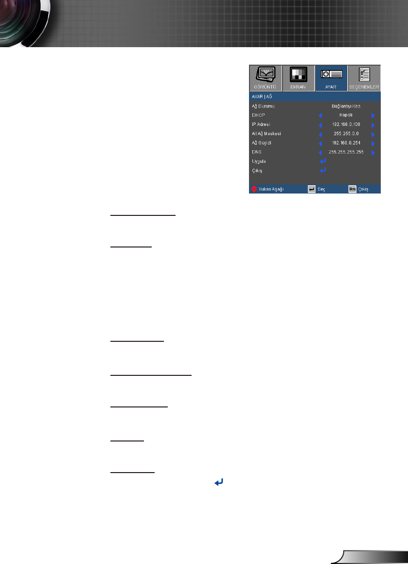 Açık: Projektöre harici bir DHCP sunucusundan otomatik olarak
