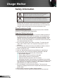 Usage Notice Precautions Please follow all warnings, precautions and maintenance as recommended in this user’s guide. ▀■ Warning- Do not look into the projector’s lens when the lamp is on. The bright light may hurt and damage your eyes. ▀■ Warning- To reduce the risk of fire or electric shock, do not expose this projector to rain or moisture. ▀■ Warning- Please do not open or disassemble the projector as this may cause electric shock.