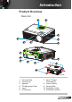 Introduction Package Overview Unpack and inspect the box contents to ensure all parts listed below are in the box. If something is missing, please contact your nearest customer service center. Projector with lens cap Due to different applications in each Country, some regions may have different accessories. 2 × AAA Batteries Documentation : User’s Manual Warranty Card Quick Start Card WEEE Card (for EMEA only) English 6 Power Cord 1.8m IR Remote Control VGA Cable 1.