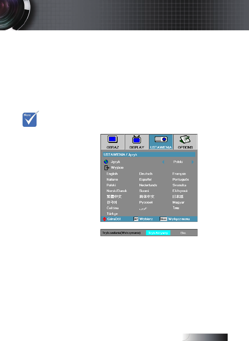 można wybrać preferowany język oraz ustawienia Trybu zasila-