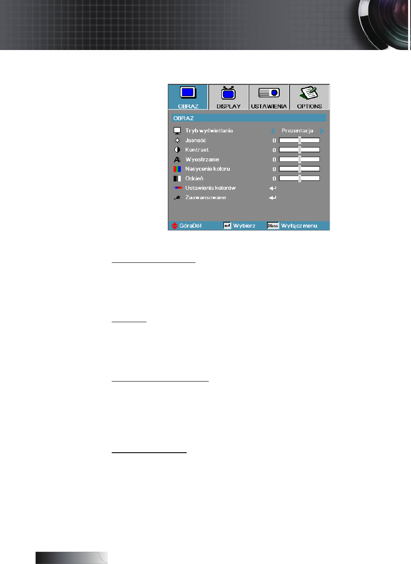 Wciśnij ◄, by zmniejszyć stopień nasycenia obrazu.