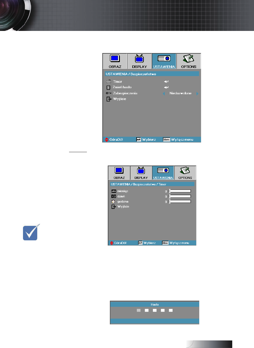 Aktywowany Timer sprawia, że projektor będzie wymagał hasła na