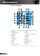 Wprowadzenie Pilot zdalnego sterowania NOTE Klawiatura numeryczna (z wyłączeniem „0” dla haseł , „0” nie może zostać użyte jako część składowa hasła) 1. Włączenie zasilania 2. Oczekiwanie 3. Funkcja 1/Funkcja 2 ( Programowalność zobacz str.58) 4. Funkcje obiektywu: (1) Fokus obiektywu (2) Zoom obiektywu (3) Przesunięcie obiektywu 5. Wskaźnik LED 6. Źródło 7. Głośność +/8. Migawka 9. Trapez 10. Tryb wyświetlania 11. HDMI 12. DVI 13. Resynchronizacja 14. Informacje 15. Keypad numeryczny 16. YPbPr 17.