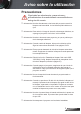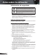 Aviso sobre la utilización Precauciones Siga todas las advertencias, precauciones y procedimientos de mantenimiento recomendados en esta guía del usuario. ▀■ Advertencia- No mire directamente a las lentes del proyector cuando la lámpara esté encendida. La luz brillante podría dañar sus ojos. ▀■ Advertencia- Para reducir el riesgo de incendio o descargas eléctricas, no exponga el proyector a la lluvia ni a la humedad.
