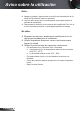 Aviso sobre la utilización Advertencias relacionadas con la seguridad de los ojos ▀■ No mire al haz del proyector en ningún momento. Dé la espalda al haz siempre que sea posible. ▀■ Cuando el proyector se utilice en un aula, supervise a los alumnos cuando les pida que señalen algo en la pantalla para que lo hagan correctamente. ▀■ Para minimizar la energía de la lámpara, haga uso de las cortinas de la sala con el fin de reducir los niveles de luz ambiente.