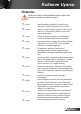 Kullanım Uyarısı Göz Güvenliği Uyarıları ▀■ Daima projektöre doğrudan bakmaktan/gözünüzü doğrultmaktan kaçının. Işına mümkün olduğunca arkanızı verin. ▀■ Projektör sınıfta kullanıldığında, ekranda birşey göstermeleri istendiğinde öğrencileri yeterince gözetim altında tutun. ▀■ Lamba gücünü en aza indirgemek için, ortamdaki ışık seviyesini azaltmak için oda jaluzileri kullanın.