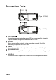 Connection Ports 1 2 3 4 MOUSE SERVICE VIDEO RS-232C (Type 1-SVGA) VGA / YPbPr 1 2 3 5 4 MOUSE VIDEO RS-232C VGA / YPbPr 1 2 3 4 5 AUDIO-IN SERVICE (Type 2-XGA) VGA/YPbPr/ Connect image input signal (analog RGB or component) to this jack. Support wireless dongle via internal power of VGA. RS-232C When operating the projector via a computer, connect this to the controlling computer's RS-232C port. VIDEO Connect composite video output from video equipment to this jack.