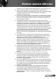 Controles del usuario SETUP SETUP Idioma Español Proyección Localización menú Configuraciones de audio Seguridad ID de Proyector Idioma Puede mostrar el menú OSD multilingüe. Presione el botón ► en el submenú y, a continuación, utilice los botones ▲ o ▼ o ◄ o ► para seleccionar su idioma preferido. Presione “Aceptar” para finalizar la selección. Posterior-Escritorio y Posterior-Techo se utilizan con una pantalla traslúcida.