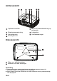 Achteraanzicht 1 2 3 4 5 1 Optioneel luchtfilter 5 2 Wisselstroomaansluiting Aansluitpoorten Kensington-slot 6 3 4 7 6 7 Sensor IR-afstandsbediening op achterzijde Luidspreker Ventilatieopeningen Onderaanzicht 1 2 1 2 2 Gaten voor plafondmontage Instelbare voet aan achterzijde Opmerking Deze projector kan worden gebruikt met een plafondmontage als steun. De plafondmontage is niet inbegrepen in de verpakking.