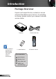 Introduction Package Overview Unpack and inspect the box contents to ensure all parts listed below are in the box. If something is missing, please contact your nearest customer service center. Projector Due to different applications in each Country, some regions may have different accessories. 2 × AAA Batteries Documentation : User’s Manual Warranty Card Quick Start Card WEEE Card (for EMEA only) English 6 Power Cord 1.