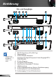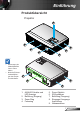 Einführung Produktübersicht Projektor 1 7 2 6 3 5 4 Änderungen der Modellspezifikationen vorbehalten. Nicht die Einlass-/ Auslassöffnungen des Projektors blockieren. 9 7 8 2 1. AN/AUS Schalter und LED Anzeige 2. Belüftung (Eingang) 3. Zoom-Ring 4. Fokusring 5. Zoom-Objektiv 6. IR-Empfänger 7. Belüftung (Ausgang) 8. Eingangs-/Ausgangs Anschlüsse 9.