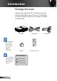 Introduction Package Overview Unpack and inspect the box contents to ensure all parts listed below are in the box. If something is missing, please contact your nearest customer service center. Projector Power Cord VGA Due to different applications in each Country, some regions may have different accessories. *1 For European warranty information please visit www.optomaeurope.