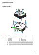 INTRODUCTION Product Overview 1 2 6 3 8 4 5 7 10 9 13 12 11 6 Note: Do not block projector inlet or outlet air vents. (*) optional accessory varies depending on model, specification, and region. No Item No Item 1. Lamp Cover 8. Lens 2. Focus Ring 9. Ventilation (inlet) 3. Zoom Lever 10. Ventilation (outlet) 4. IR Receiver 11. KensingtonTM Lock Port 5. Keypad 12. Power Socket 6. Tilt-Adjustment Foot 13. Input / Output 7.