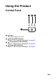 Using the Product Control Panel 2 3 4 1 1 2 3 4 Power Turn the projector on or off. (Power LED indicator) Refer to “LED Indicator Messages” on page 65. (Temperature LED indicator) Refer to “LED Indicator Messages” on page 65. (Lamp LED indicator) Refer to “LED Indicator Messages” on page 65.