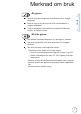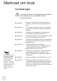 Merknad om bruk Forholdsregler Følg alle advarsler, forholdsregler og merknader om vedlikehold som er anbefalt i denne bruksanvisningen. Note ote Når lampen har nådd slutten av sin levetid, vil ikke projektoren kunne skrus på før lampemodulen er byttet ut. For å bytte ut lampen må du følge fremgangsmåten som beskrives i delen “Bytte ut lampen” på side 67. 4 Advarsel- Ikke se inn i projektorens linse når lampen er skrudd på. Det skarpe lyset kan skade øynene dine.