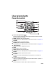 Información general del proyector Vista frontal 9 7 8 Salida de aire Entrada de aire 1 2 3 1 2 3 4 5 Sensor frontal para el mando a distancia de infrarrojos Pie del elevador Lente de proyección Anillo de enfoque Altavoz 4 5 6 6 Orificios de ventilación 7 Control de zoom Panel de control Tapa de la lámpara 8 9 ES-7
