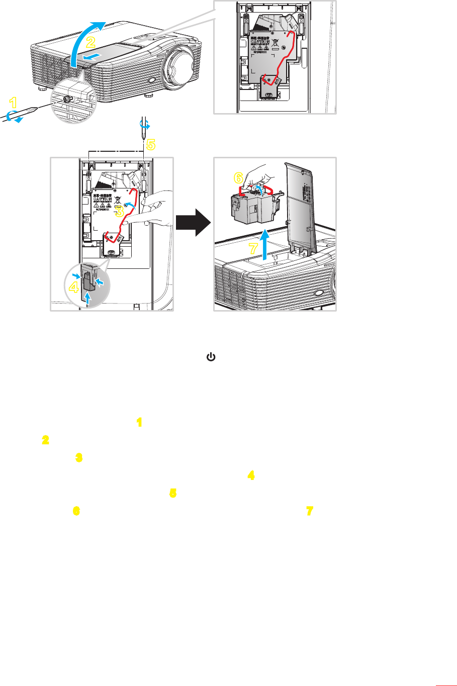 Lift up the lamp handle 9. 6 and remove the lamp module slowly and carefully. 7