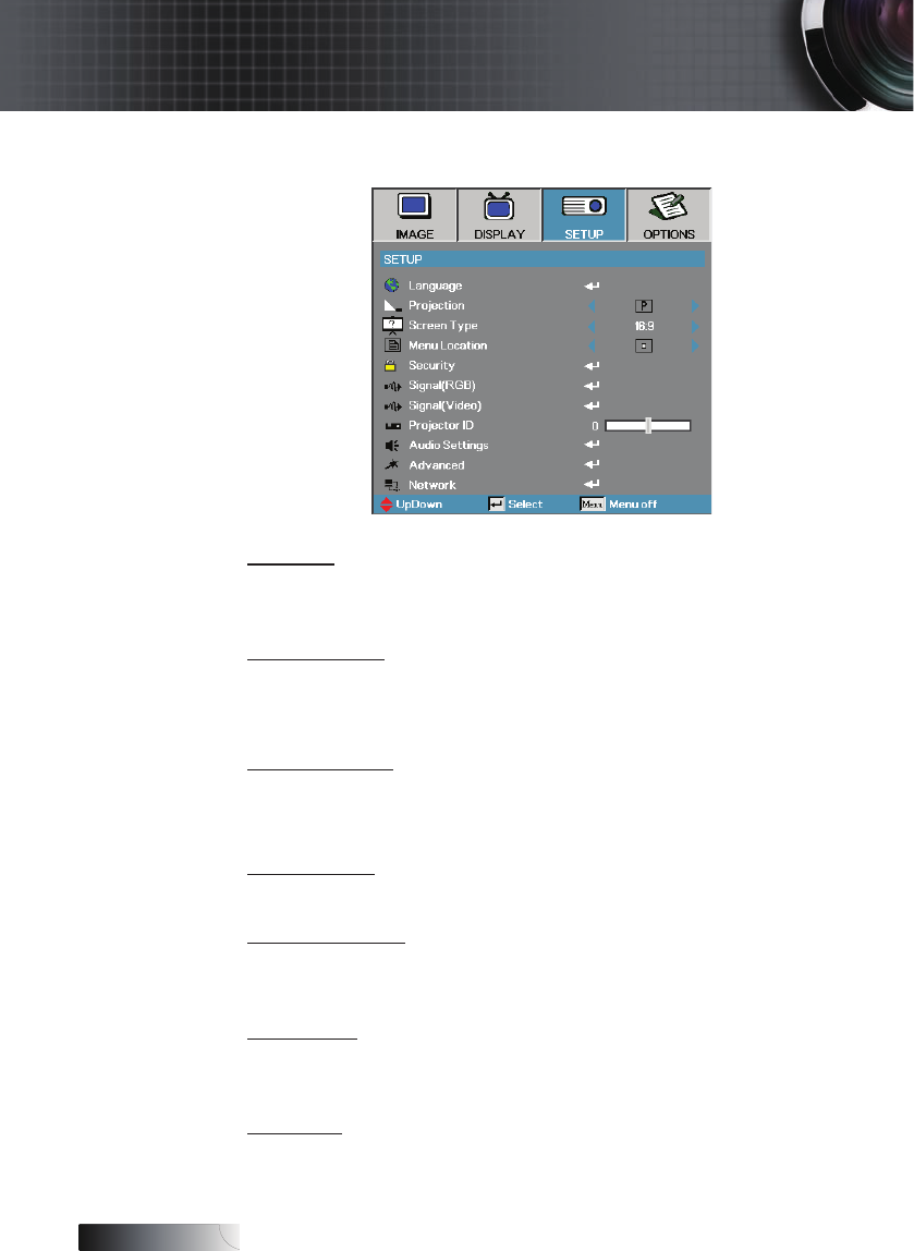 Enter the Signal (RGB) menu. Set projector signal properties. The function