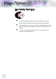 Usage Notice Precautions Please follow all warnings, precautions and maintenance as recommended in this user’s guide. Note ote When the lamp reaches the end of its life, the projector will not turn back on until the lamp module has been replaced. To replace the lamp, follow the procedures listed under "Replacing the Lamp" section on page 66. 4 ▀■ Warning- Do not look into the projector's lens when the lamp is on. The bright light may hurt your eyes.