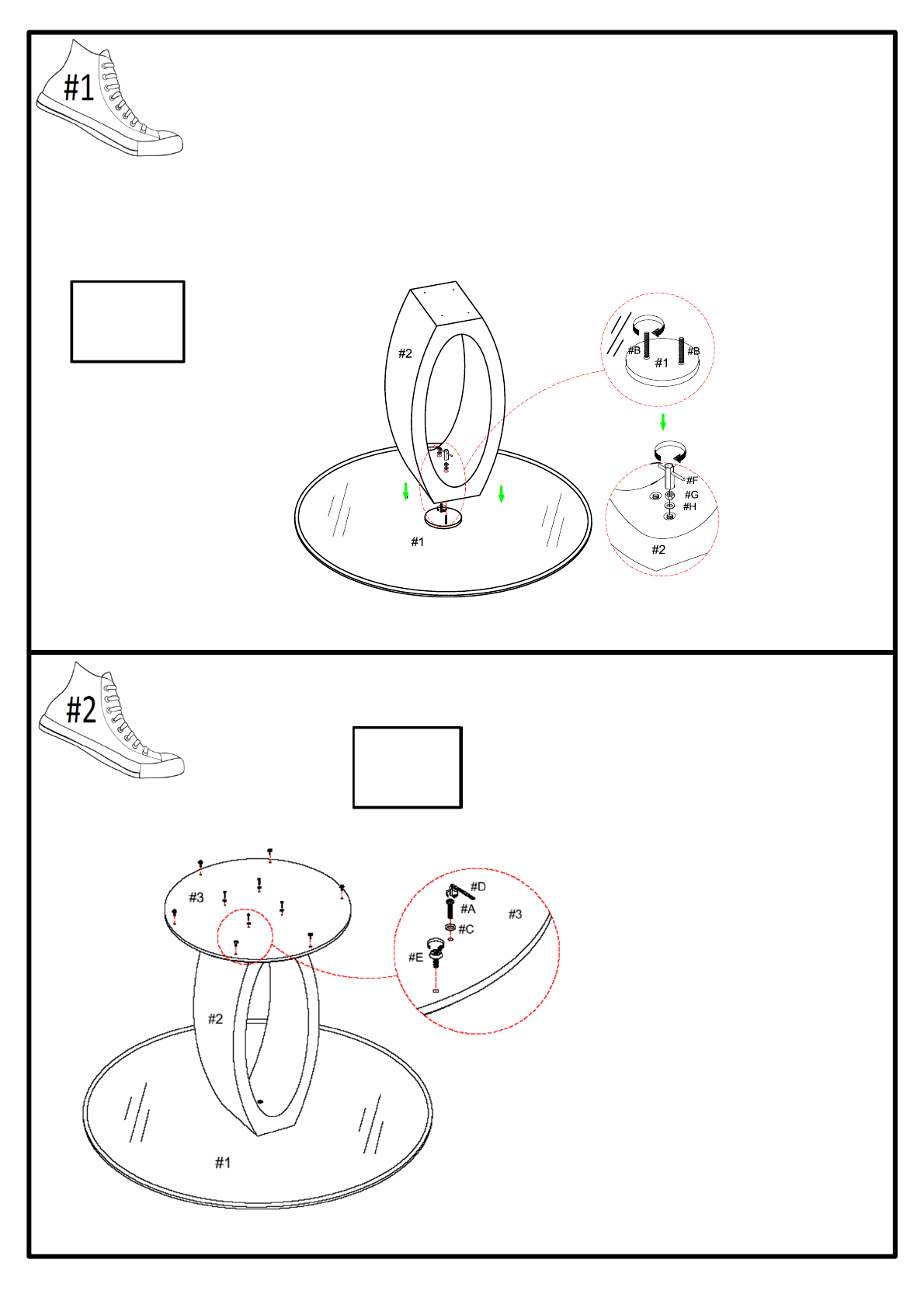 III. Place the pedestal (#2) over the 2 threaded studs (#B). Then