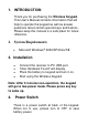1. INTRODUCTION Thank you for purchasing the Wireless Keypad. This User’s Manual contains information that will help to operate the keypad as well as answer questions about certain special keys and buttons. Please keep this manual in a safe place for future reference. 2. System Requirements ® Microsoft Windows 2000/XP/Vista/7/8 3. Installation Connect the receiver to PC USB port. “New Hardware Found” will display. Place the battery to keypad and turn it on. Start using the Wireless Keypad.